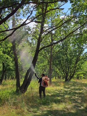 Оброблення дерев на КНП дуба звичайного стимулюючим препаратом Квантум Бор + Молібден актив із застосуванням бензинового мотообприскувача Forte 3W-650