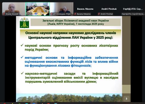 7 листопада директор Олег Василевський та старший науковий співробітник – Зіновій Юрків прийняли участь у засіданні Лісівничої академії наук України (ЛАН України). Захід відбувався у змішаному форматі (онлайн, офлайн) у залі засідань адміністративного корпусу Національного лісотехнічного університету України.